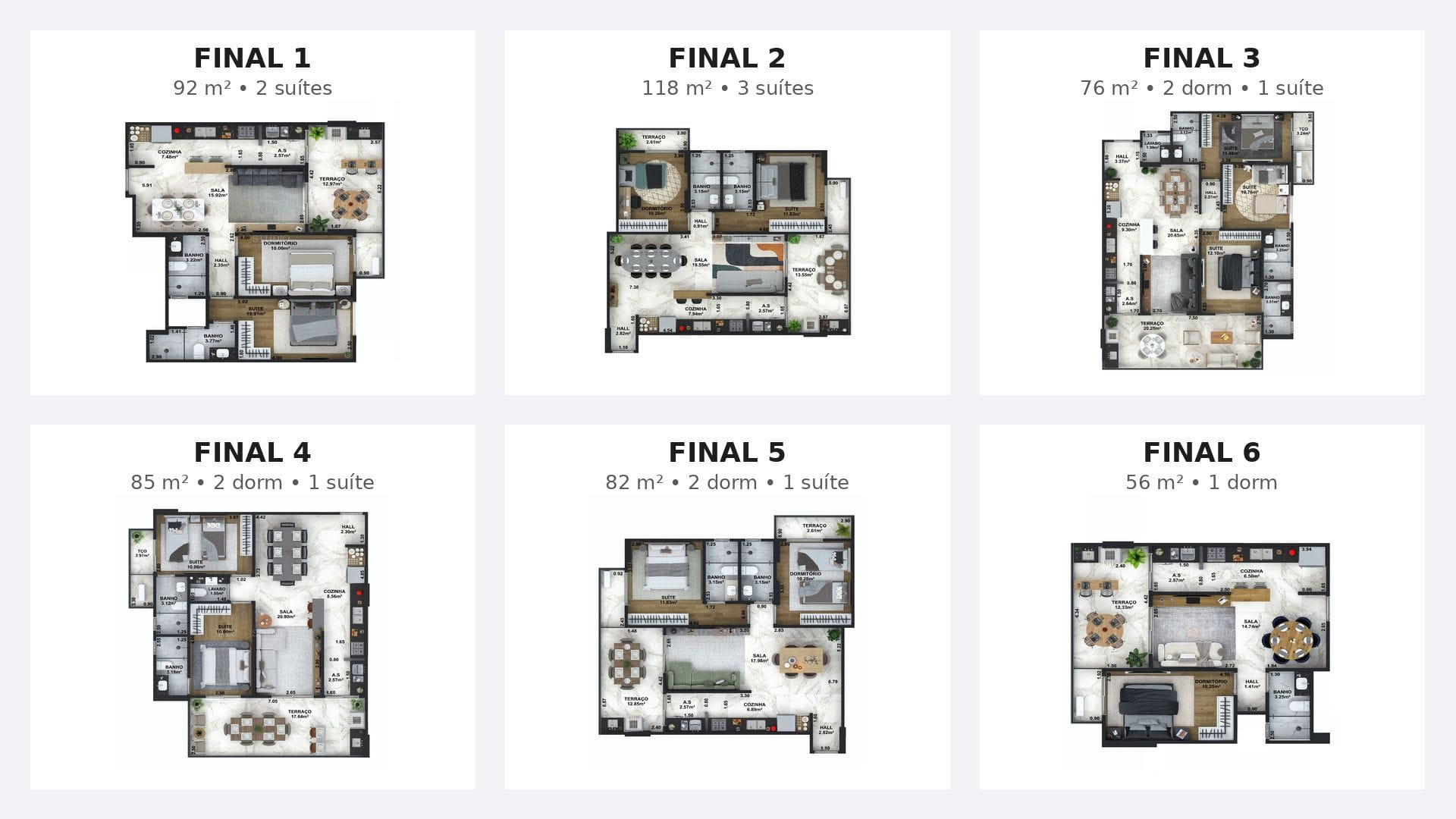 As unidades oferecem desde apartamentos compactos a configurações amplas, permitindo atender diferentes estilos de vida. Os ambientes foram projetados para criar espaços funcionais e acolhedores para morar, receber amigos ou aproveitar momentos em família.